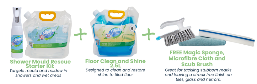 Shower Mould Start Pack + Floor Clean & Shine + Free Micro Fibre Cloth, Magic Sponge & Hand Held Scrubbing Brush